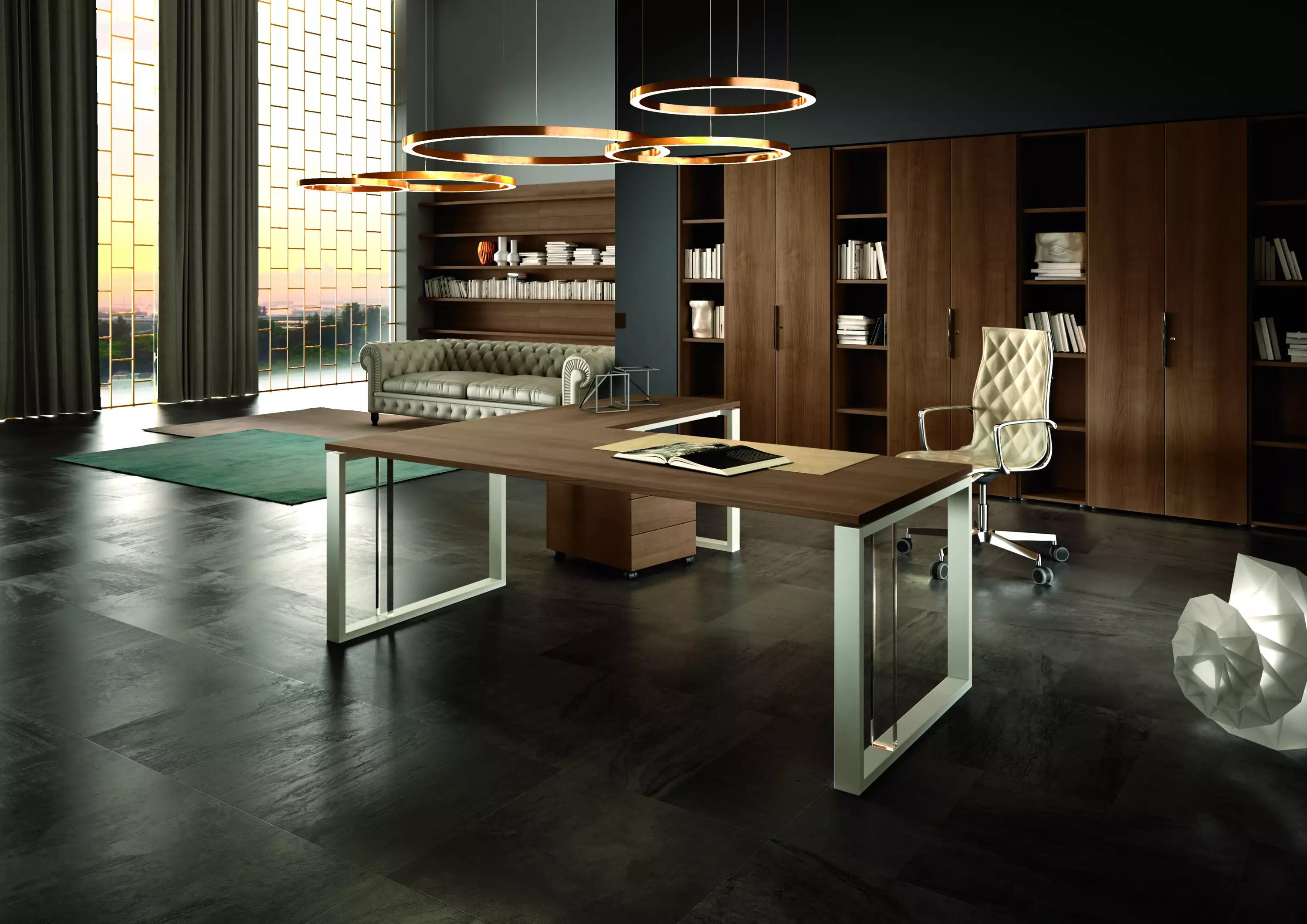 Italialaisen Della Roveren valmistamassa upeassa johtajantyöpöydässä on erikoisuutena jalkarakenteen lasipylväät.