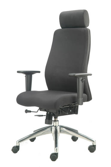 Korkea selkänojainen työtuoli, jossa säädettävä niskatuki.